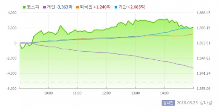 이날 코스피는 전일 대비 0.82% 상승한 1953.63으로 장을 시작했다. 이후 지수는 1950선 부근에서 움직였다. 장 중반 외국인과 기관이 동반 사자에 나서면서 상승폭을 확대했다.