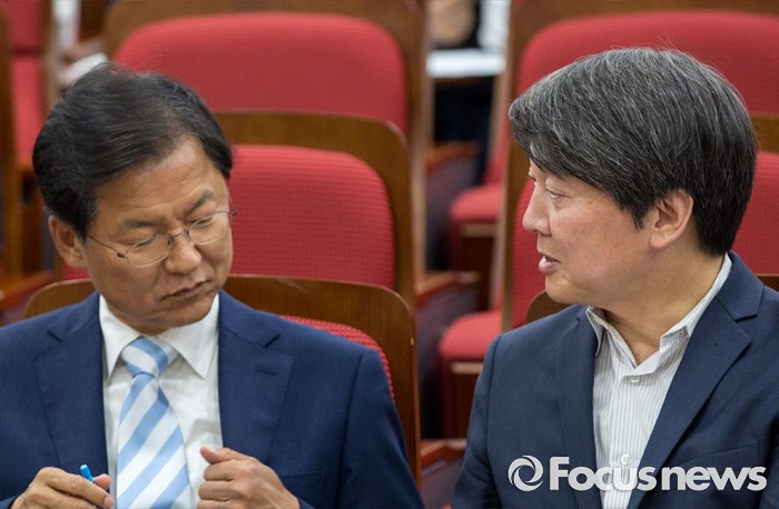 (서울=포커스뉴스) 안철수(오른쪽) 국민의당 상임공동대표와 천정배 국민의당 공동대표가 25일 오후 서울 여의도 국회의원회관에서 열린 '제조물 책임법 문제점 개선방안 토론회'에 참석해 대화를 나누고 있다.