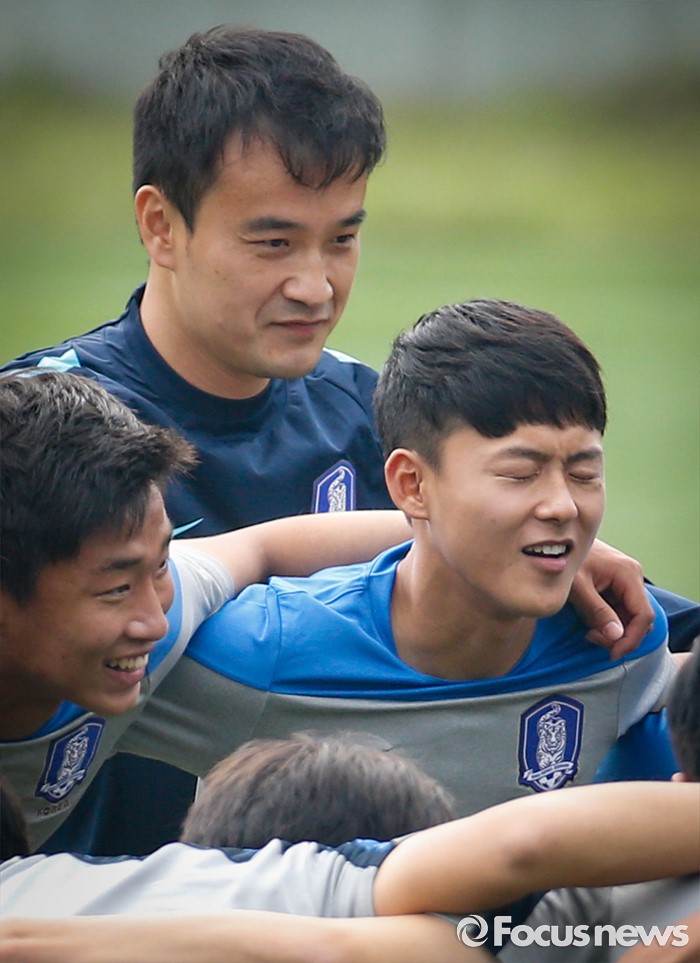 (파주=포커스뉴스) 이승우(18, 바르셀로나 후베닐A)가 25일 오후 경기도 파주 NFC에서 잉글랜드 U18(18세 이하) 대표팀과의 친선전을 앞두고 축구대표팀 선수들과 소집 훈련에 임하고 있다.