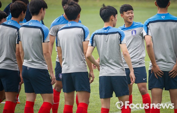 (파주=포커스뉴스) 이승우(18, 바르셀로나 후베닐A)가 25일 오후 경기도 파주 NFC에서 잉글랜드 U18(18세 이하) 대표팀과의 친선전을 앞두고 축구대표팀 선수들과 소집 훈련에 임하고 있다.