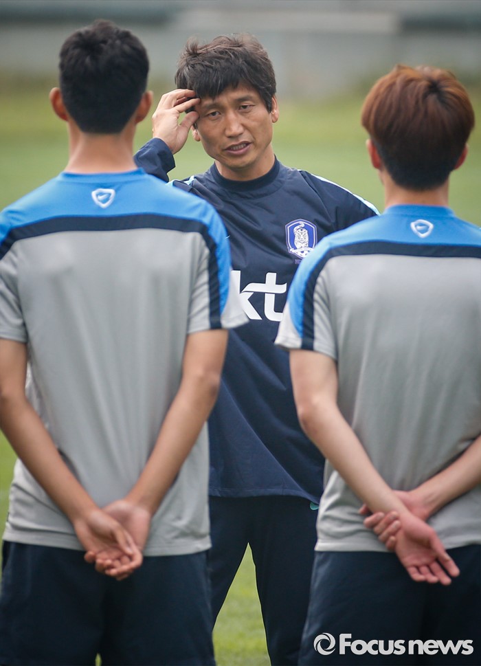 (파주=포커스뉴스) 25일 오후 경기도 파주 NFC에서 진행된 U-18(18세 이하) 축구대표팀 소집 훈련에 참석한 정정용 감독이 선수들과 대화하고 있다.