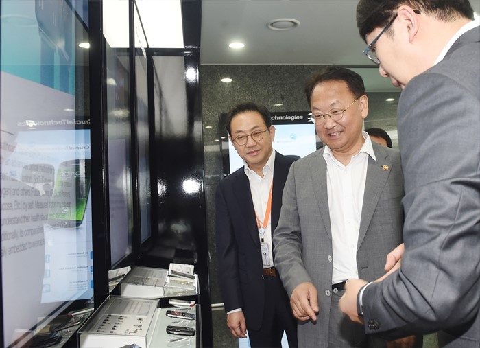 (성남=포커스뉴스) 유일호 부총리 겸 기획재정부 장관이 25일 벤처.창업 관련 현장방문의 일환으로 경기도 판교 테크노벨리 소재 (주)크루셜텍을 방문, 관계자로부터 제품과 연구시설의 설명을 듣고 있다. <사진제공=기획재정부>
