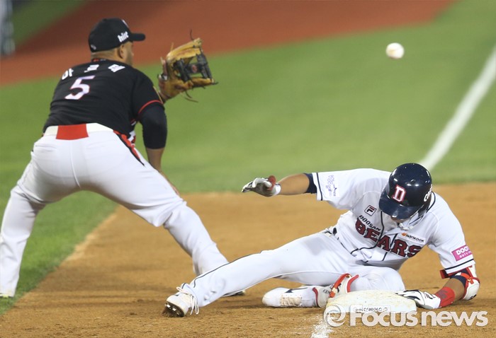 (서울=포커스뉴스) 25일 서울 잠실구장에서 열린 2016프로야구 kt-두산 경기 3회말 무사 2,3루에서 두산 허경민이 좌중간 3루타를 치고 3루에서 슬라이딩하며 세이프되고 있다. kt 3루수는 마르테.
