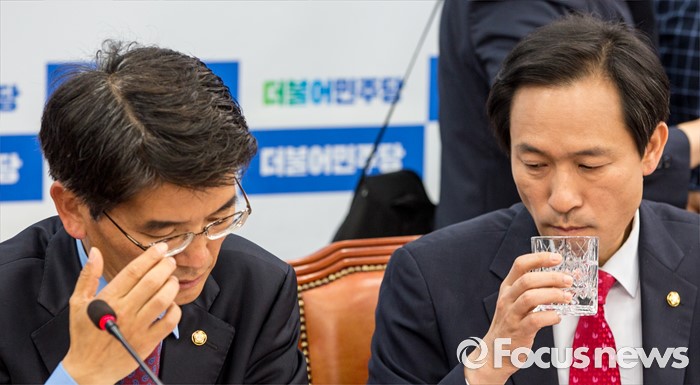(서울=포커스뉴스) 우상호(오른쪽) 더불어민주당 원내대표가 26일 오전 서울 여의도 국회에서 열린 정책조정회의에 참석해 물을 마시고 있다.