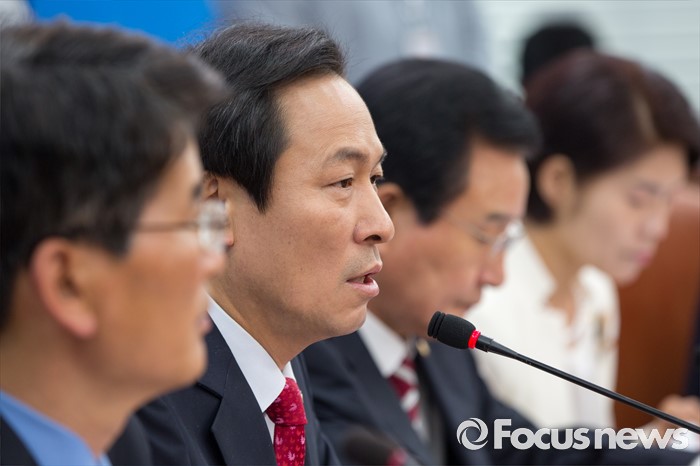 (서울=포커스뉴스) 우상호(왼쪽 두 번째) 더불어민주당 원내대표가 26일 오전 서울 여의도 국회에서 열린 정책조정회의에 참석해 모두발언 하고 있다.
