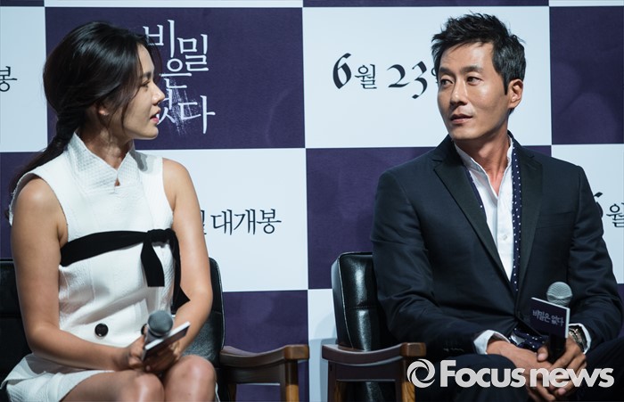 (서울=포커스뉴스) 26일 오전 서울 강남구 압구정 CGV에서 열린 영화 '비밀은 없다' 제작보고회에 참석한 배우 손예진(왼쪽)과 김주혁이 주변을 살펴보고 있다.