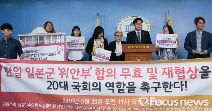 (서울=포커스뉴스) 26일 오전 서울 여의도 국회 정론관에서 홍익표, 이인영 더불어민주당 의원과 윤미향 한국정신대문제대책협의회 상임대표, 위안부 피해자 김복동 할머니 등이 한일 일본군 '위안부' 합의 무효 및 재협상을 위한 20대 국회의 역할 촉구 기자회견을 하고 있다.