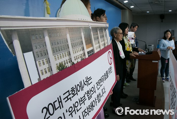 (서울=포커스뉴스) 26일 오전 서울 여의도 국회 정론관에서 홍익표, 이인영 더불어민주당 의원과 윤미향 한국정신대문제대책협의회 상임대표, 위안부 피해자 김복동 할머니 등이 한일 일본군 '위안부' 합의 무효 및 재협상을 위한 20대 국회의 역할 촉구 기자회견을 하고 있다.