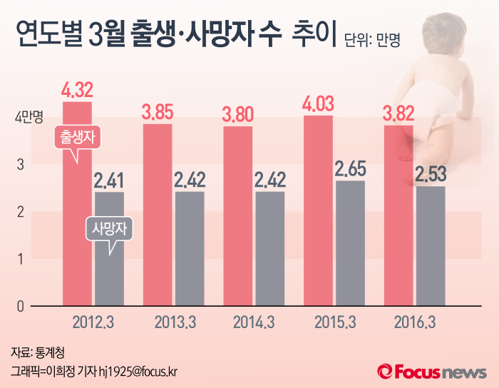 (서울=포커스뉴스) 26일 통계청이 공개한 ‘2016년 3월 인구동향’에 따르면 올 3월 출생아 수는 3만8200명으로 전년동월보다 2100명이 줄었다. 사망자 수도 2만5300명으로 전년동월보다 4.5% 감소했다.