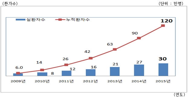 그는 “관계 부처와 협력해 한국 의료 우수성 홍보를 통한 인지도 제고, 통역․음식․숙박․교통 등 비의료서비스 시장 활성화 지원, 환자가족 등 연계 관광 개발 등을 통해 2020년에는 100만명 유치 목표를 달성할 수 있기를 바란다“고 덧붙였다.2009-2015년 외국인환자 유치 현황 <자료출처=보건복지부>2009~2015년 주요 국적별 외국인환자 현황 <자료출처=보건복지부>