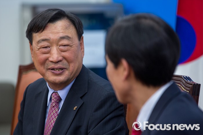(서울=포커스뉴스) 이희범(왼쪽) 평창동계올림픽조직위원장이 26일 오후 서울 여의도 국회에서 우상호 더불어민주당 원내대표를 예방하고 있다.