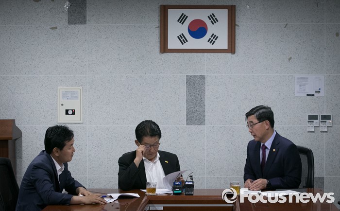 (서울=포커스뉴스) 박지원(가운데) 국민의당 원내대표, 김관영(왼쪽) 원내수석부대표가 26일 오후 서울 여의도 국회 의원회관에서 이기권 고용노동부 장관과 면담을 하고 있다.