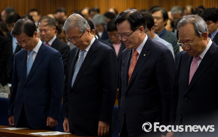 (서울=포커스뉴스) 26일 오후 서울 여의도 국회 헌정기념관에서 열린 '새한국의 비전' 창립 기념식에서 천정배(앞줄 왼쪽부터) 국민의당 공동대표, 김종인 더불어민주당 비상대책위 대표, 정의화 국회의장, 박관용 전 국회의장 및 참석자들이 묵념하고 있다.