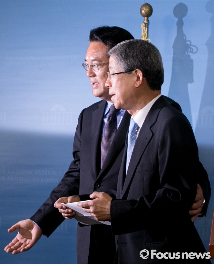 (서울=포커스뉴스) 새누리당 혁신비대위원장에 내정된 김희옥(오른쪽) 전 동국대 총장과 정진석 원내대표가 26일 오후 서울 여의도 국회 정론관에서 기자회견을 마친 뒤 취재진 질문에 답하기 위해 이동하고 있다.