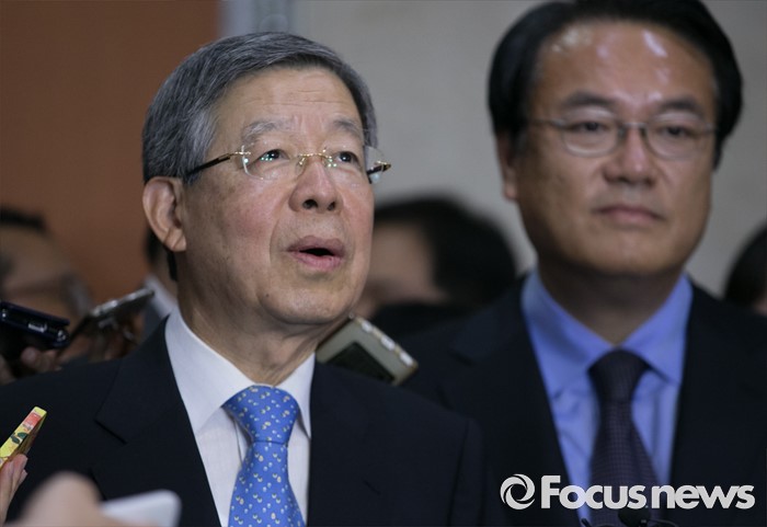 (서울=포커스뉴스) 새누리당 혁신비대위원장에 내정된 김희옥(왼쪽) 전 동국대 총장과 정진석 원내대표가 26일 오후 서울 여의도 국회 정론관에서 기자회견을 마친 뒤 취재진 질문에 답하고 있다.