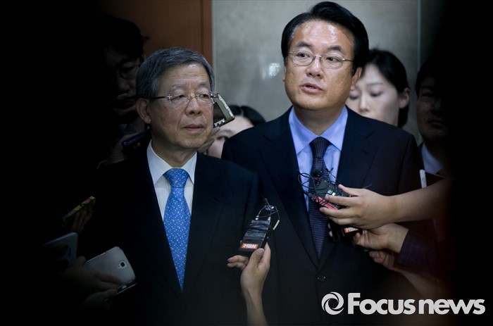 (서울=포커스뉴스) 새누리당 혁신비대위원장에 내정된 김희옥(왼쪽) 전 동국대 총장과 정진석 원내대표가 26일 오후 서울 여의도 국회 정론관에서 기자회견을 마친 뒤 취재진 질문에 답하고 있다.