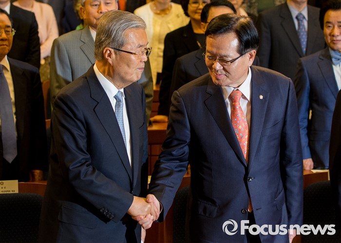 (서울=포커스뉴스) 26일 오후 서울 여의도 국회 헌정기념관에서 열린 '새한국의 비전' 창립 기념식에 참석한 정의화(오른쪽) 국회의장과 김종인 더불어민주당 비상대책위 대표가 악수하고 있다.