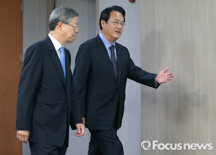 (서울=포커스뉴스) 새누리당 혁신비대위원장에 내정된 김희옥(왼쪽) 전 동국대 총장과 정진석 원내대표가 26일 오후 서울 여의도 국회 정론관에서 기자회견을 위해 입장하고 있다.