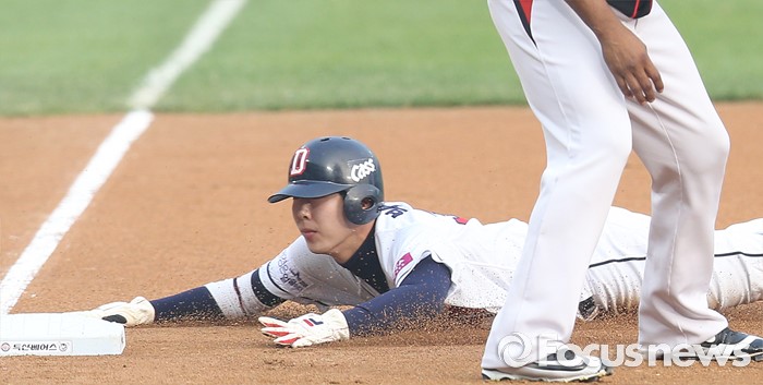 (서울=포커스뉴스) 26일 서울 잠실구장에서 열린 2016프로야구 kt-두산 경기 1회말 1사1루에서 두산 1루주자 박건우가 kt 투수 정성곤의 견제구가 빠진 사이 3루까지 뛰어 세이프되고 있다.
