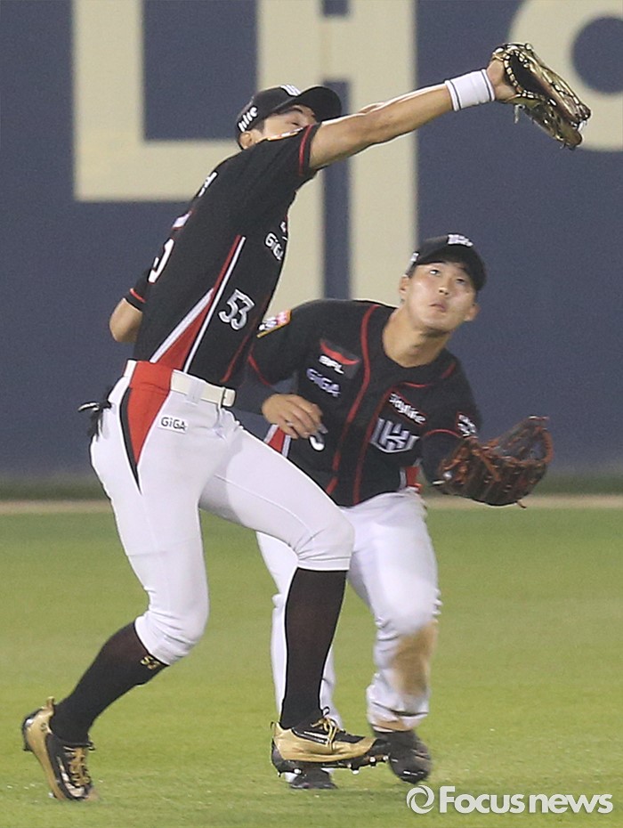 (서울=포커스뉴스) 26일 서울 잠실구장에서 열린 2016프로야구 kt-두산 경기 4회말 2사 1,2루에서 kt 좌익수 이대형이 두산 오재일의 뜬공 타구를 잡고 있다. 뒤는 중견수 배병옥.