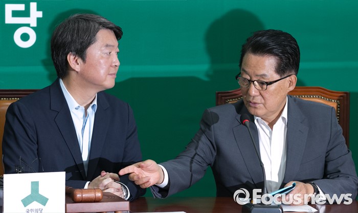 (서울=포커스뉴스) 안철수(왼쪽) 국민의당 상임공동대표, 박지원 원내대표가 27일 오전 서울 여의도 국회에서 열린 최고위원회의에 참석해 마이크를 옮기기 위해 대화하고 있다.