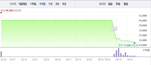 현재 주가는 16일 2만2200원을 기록했던 주가와 비교했을 때 18.86% 하락한 수치다.