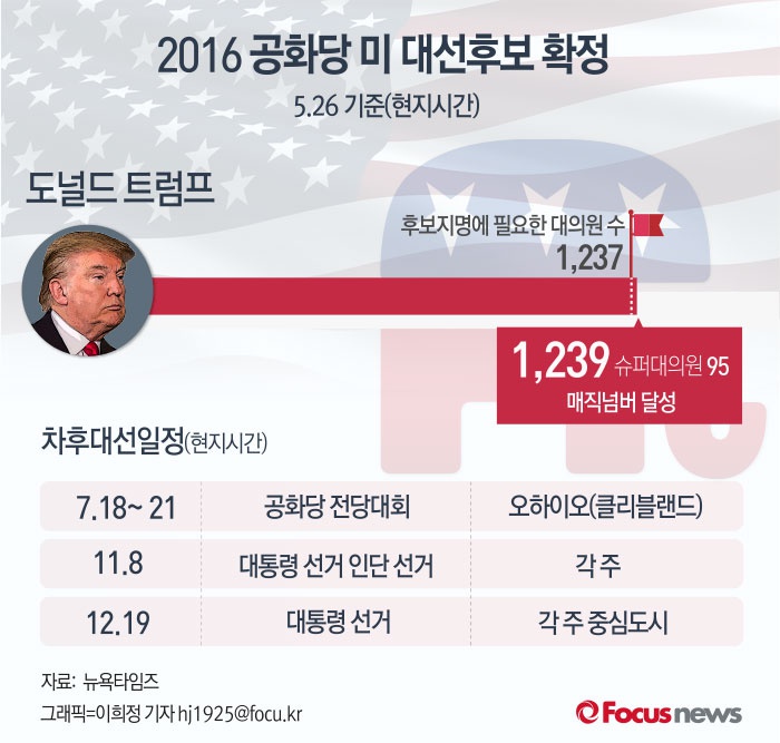 (서울=포커스뉴스) 지난 24일 워싱턴주 경선 승리로 트럼프가 대의원 1239명을 확보해 대선 후보지명에 필요한 대의원수인 매직넘버(1237명)를 달성했다. 이로써 트럼프는 오는 7월 미국 클리블랜드에서 열리는 공화당 전당대회에서 공화당 대선후보로 공식 지명된다.