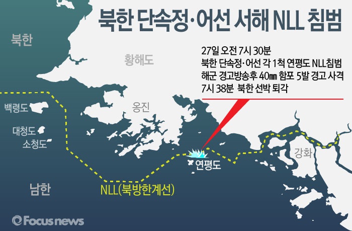(서울=포커스뉴스) 27일 합동참모본부는 이날 오전 북한의 어선과 단속정이 서해 북방한계선(NLL)을 침범해 우리 해군이 경고사격을 하여 퇴각시켰다고 밝혔다.