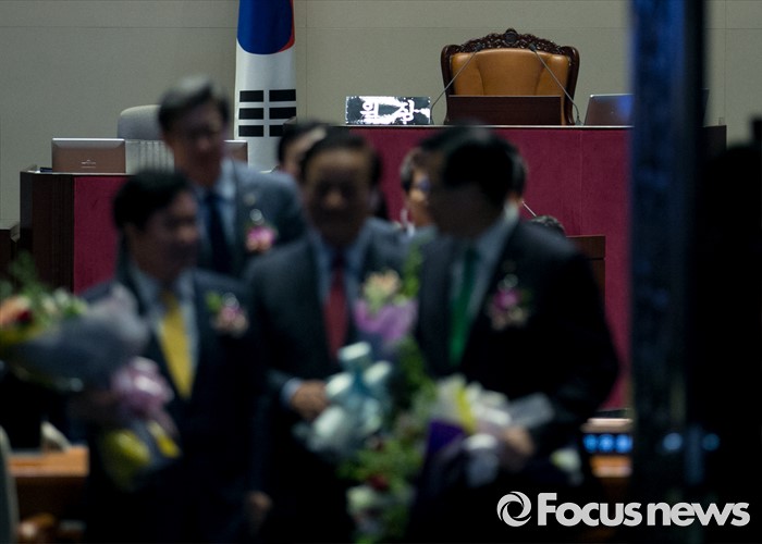 (서울=포커스뉴스) 27일 오전 서울 여의도 국회에서 68주년 국회 개원 기념식을 마친 정의화 국회의장이 본회의장에서 정갑윤, 이석현 국회 부의장 등 직원들과 함께 기념촬영 후 나서고 있다.