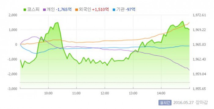 27일 코스피지수는 전일 대비 0.62%(12.11포인트) 오른 1969.17에 장을 마쳤다. 코스닥지수는 전날 보다 0.52%(3.60포인트) 상승한 691.54에 마감했다.