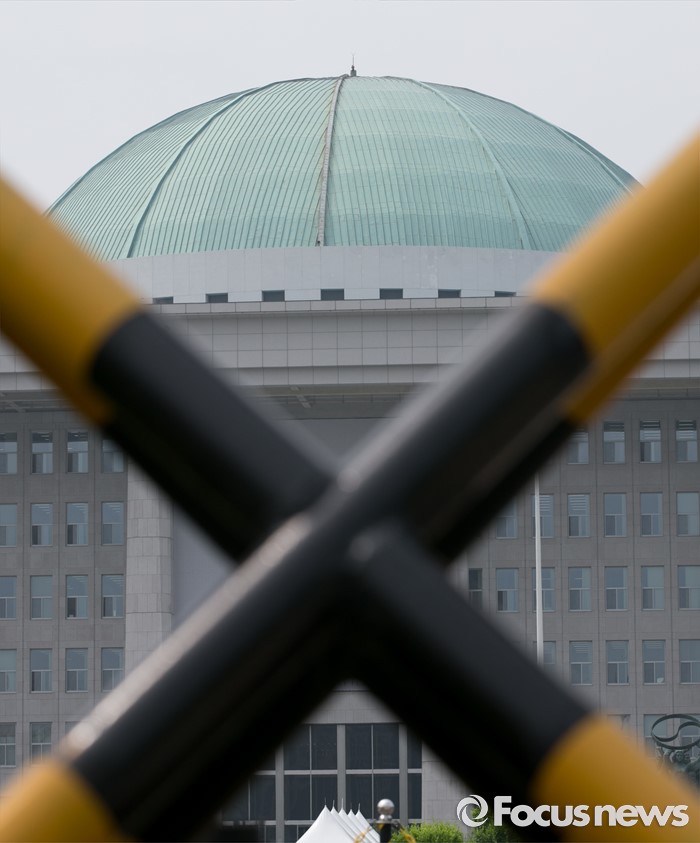 (서울=포커스뉴스) 정부가 상시 청문회 등의 내용이 포함된 국회법 개정안에 대해 거부권을 행사해 여야가 입장 차이를 보이고 있는 27일 오후 서울 여의도 국회 정문 바리케이트 너머로 본청이 보이고 있다.