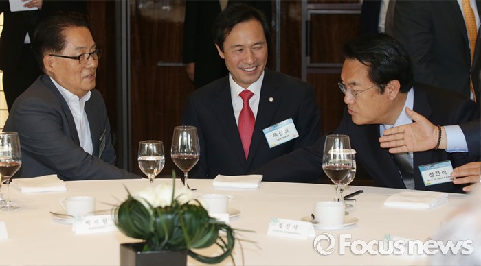 (서울=포커스뉴스) 27일 오후 서울 웨스틴 조선호텔에서 열린 2016 한반도통일 심포지엄 기념 오찬에 참석한 정진석(오른쪽부터) 새누리당 원내대표, 우상호 더불어민주당 원내대표, 박지원 국민의당 원내대표가 대화하고 있다.