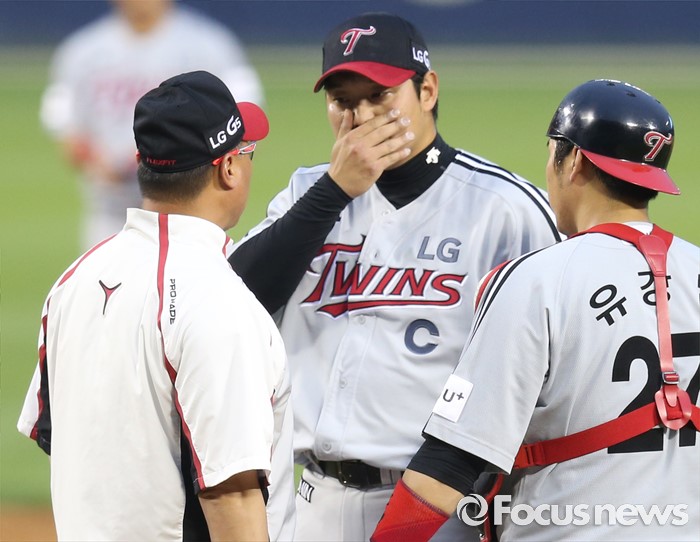 (서울=포커스뉴스) 27일 서울 잠실구장에서 열린 2016프로야구 LG-두산 경기에서 LG 강상수 투수코치가 2회말 연속 안타를 맞고 실점한 투수 류제국을 격려하고 있다.