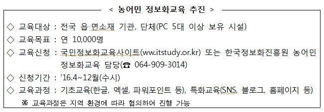 29일 미래부에 따르면 연간 1만명의 농어민을 대상으로 컴퓨터 기초교육과 스마트폰‧SNS활용 등 특화과정을 개설 및 운영할 예정이다. PC를 5대 이상 보유한 읍·면 소재 기관 중 선정된 기관은 최대한 연 9개월, 월 2개 과목, 과목당 30시간의 교육을 기준으로 전문강사와 교재를 무료로 지원받는다.