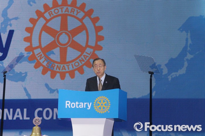 (서울=포커스뉴스) 반기문 유엔 사무총장이 29일 오전 경기 고양시 킨텍스 제1전시장에서 열린 2016 국제로타리 세계대회에 참석해 기조연설 하고 있다.
