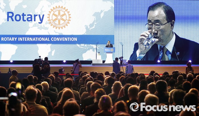 (서울=포커스뉴스) 반기문 유엔 사무총장이 29일 오전 경기 고양시 킨텍스 제1전시장에서 열린 2016 국제로타리 세계대회에 참석해 물을 마시고 있다.
