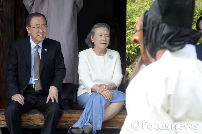 (안동=포커스뉴스) 29일 오후 경북 안동 하회마을을 방문한 반기문 유엔 사무총장과 부인 유순택 여사가 중요무형문화재 제69호 하회별신굿탈놀이를 관람하고 있다.