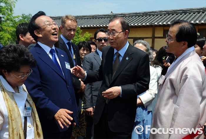 (안동=포커스뉴스) 반기문 유엔 사무총장이 29일 오후 유네스코 세계문화유산으로 등재된 경북 안동 하회마을을 방문해 엘리자베스2세 영국 여왕의 기념 식수를 구경하며 이야기를 나누고 있다.