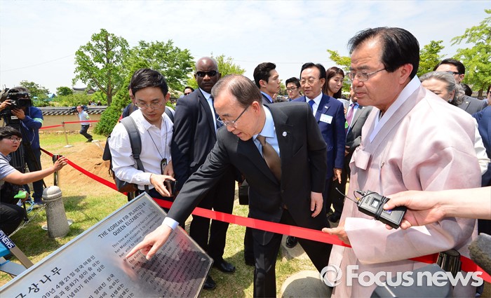 (안동=포커스뉴스) 반기문 유엔 사무총장이 29일 경북 안동 하회마을 충효당 인근에서 기념식수를 마치고 1999년 엘리자베스 2세 영국 여왕이 방문 당시 심었던 구상나무를 둘러보고 있다.