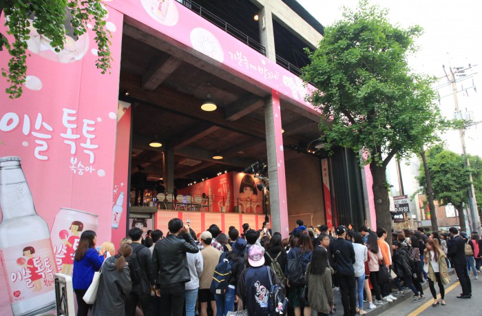 한편, '이슬톡톡'은 편의점과 대형마트에선 캔 제품을, 이자카야·포차 등 업소에선 병 제품으로 만날 수 있다.지난 4월29일 가로수길에서 개최된 '이슬톡톡 발그레 메이크업 파티'에 참여하려는 이들이 길게 줄을 서 기다리고 있다.