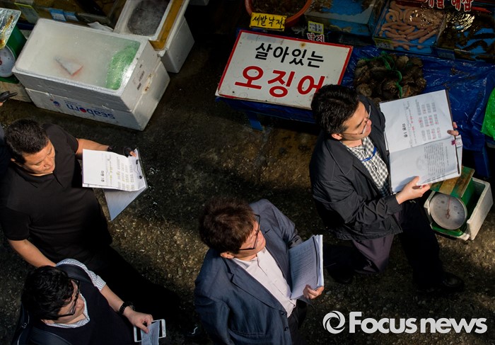 (서울=포커스뉴스) 30일 오전 서울 동작구 구 노량진수산시장에서 서울중앙지법 관계자들이 법원의 점유이전금지가처분을 집행하고 있다. 법원은 이날 영업은 지속하되 수협의 동의없이 가게를 타인에게 이전·전대하면 안된다고 상인들에게 통보 했다.