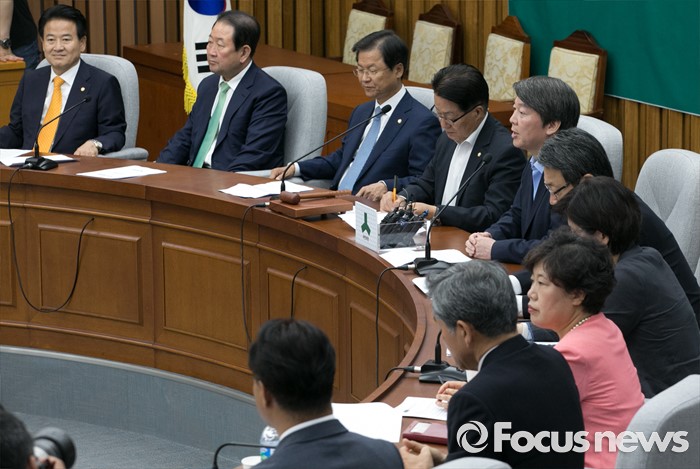 (서울=포커스뉴스) 20대 국회 임기가 시작된 30일 오전 서울 여의도 국회에서 열린 국민의당 의원총회에 참석한 안철수(왼쪽 다섯번째) 상임공동대표가 모두발언을 하고 있다.