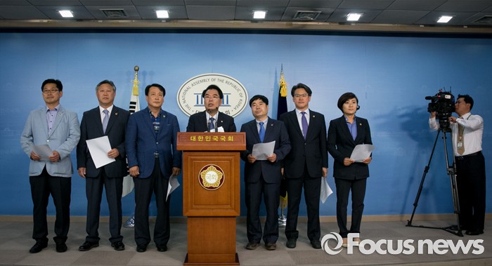 (서울=포커스뉴스) 백재현(왼쪽 네번째) 더불어민주당 의원과 경기도의회 예산결산특별위원회 의원들이 30일 오전 서울 여의도 국회 정론관에서 누리과정 예산 관련 갈등 해결 촉구 기자회견을 하고 있다.