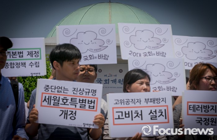 (서울=포커스뉴스) 30일 오전 서울 여의도 국회 앞에서 참여연대 등 관련단체 회원들이 20대 국회에서 우선 다뤄야 할 입법·정책과제 제안 및 국회 개혁 촉구 기자회견을 하고 있다.