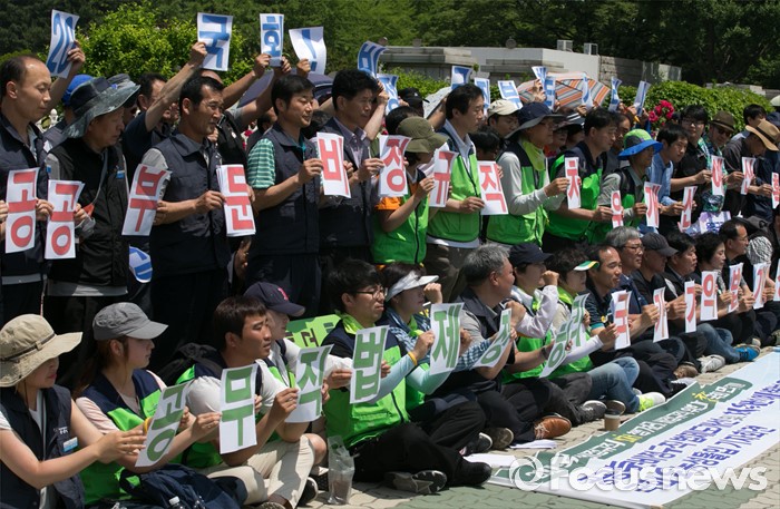(서울=포커스뉴스) 30일 오전 서울 여의도 국회 앞에서 열린 공공부문비정규직 법제도개선 및 처우개선 예산확보 요구 쟁취를 위한 농성돌입 기자회견에 참가한 관계자들이 손피켓을 들고 있다.