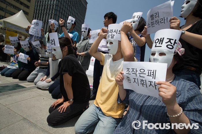 (서울=포커스뉴스) 30일 오후 서울 종로구 광화문 광장에서 환경보건시민센터 관계자들이 옥시 전 사장 검찰소환 조사 촉구하는 기자회견 및 퍼포먼스를 열고 있다.