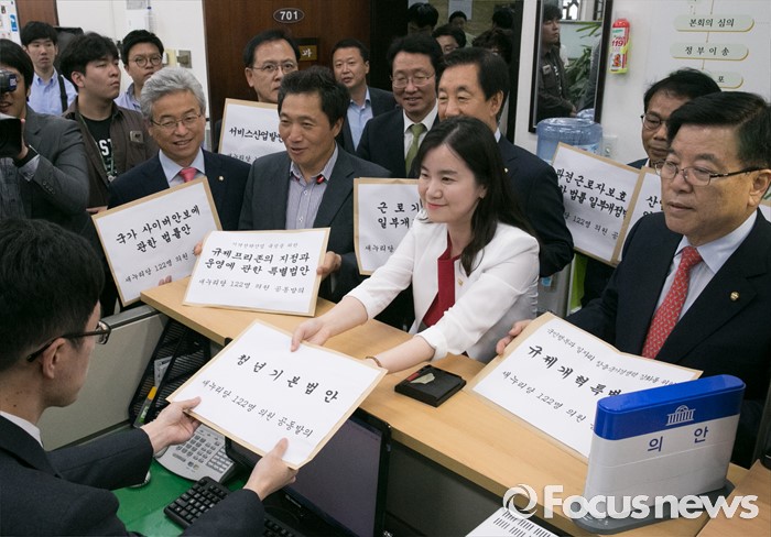 (서울=포커스뉴스) 20대 국회 임기가 시작된 30일 오후 서울 여의도 국회 의안과에서 김광림(오른쪽 첫번째) 새누리당 정책위의장, 신보라(오른쪽 두번째) 청년소통특위 부위원장 등 의원들이 당론 1호법안인 청년기본법과 규제프리존법, 서비스법 등 9개 법안 서류를 제출하고 있다.