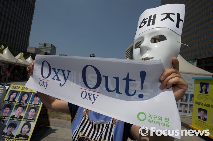 (서울=포커스뉴스) 30일 오후 서울 종로구 광화문 광장에서 환경보건시민센터 관계자들이 옥시 전 사장 검찰소환 조사 촉구하는 기자회견 및 퍼포먼스를 열고 있다.