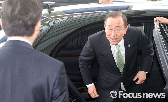 (인천공항=포커스뉴스) 방한 일정을 마친 반기문 유엔 사무총장이 30일 오후 출국을 위해 인천국제공항에 도착, 차량에서 내리고 있다.
