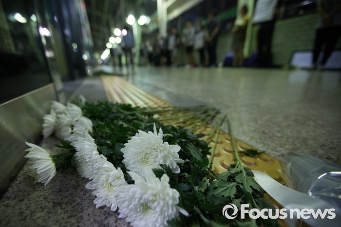 (서울=포커스뉴스) 30일 오후 서울 광진구 구의역 내 스크린도어 사망사고 발생 장소인 9-4 승강장에 국화가 놓여져 있다.